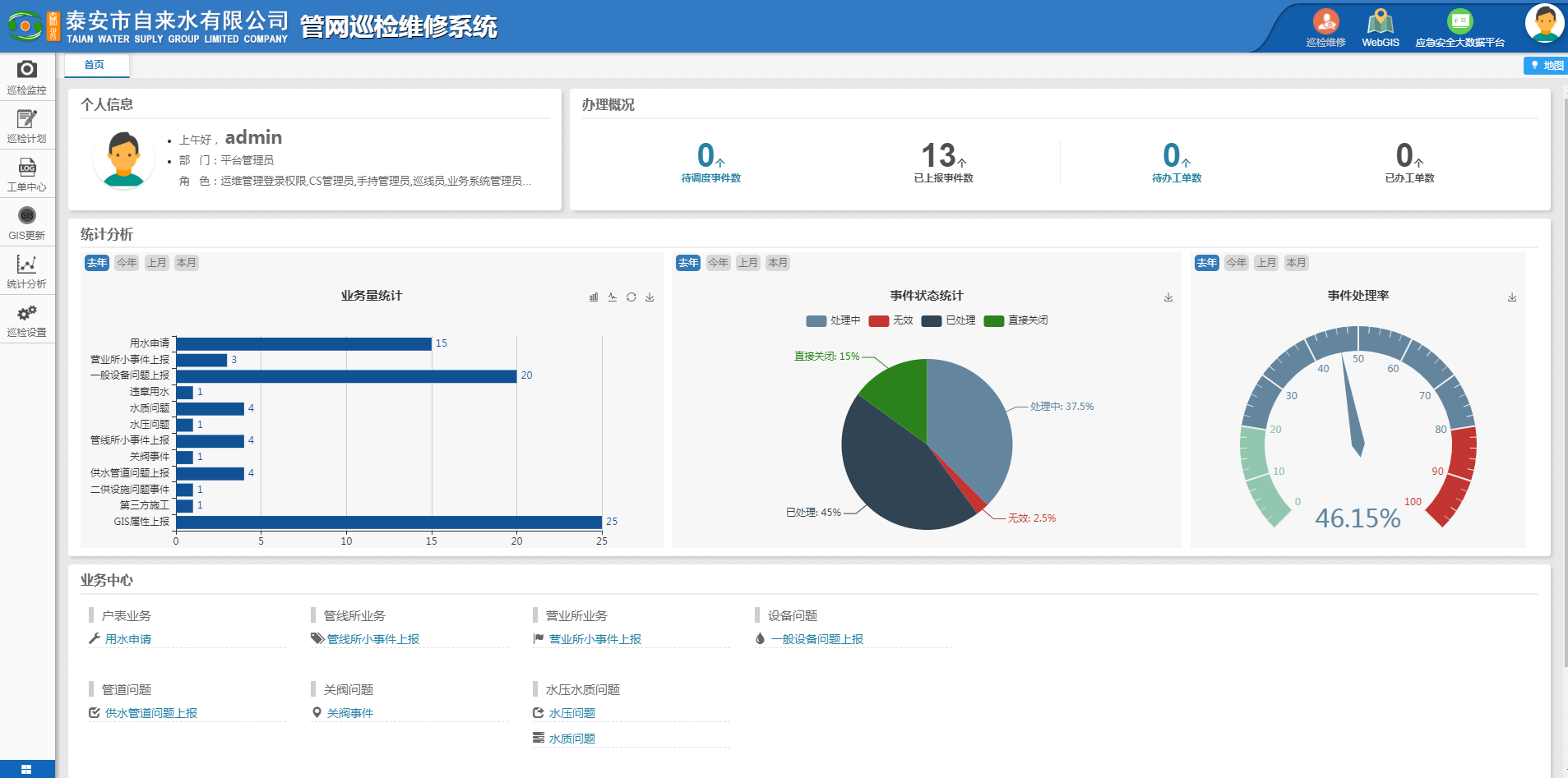 公司领导组织有关部门、人员对供水GIS系统建设进行了认真细致的考察、调研,对公司业务流程梳理及系统接口需求进行了沟通整理。公司供水GIS系统包含四大模块,有供水管理地理信息系统C/S(内网系统)、供水管网地理信息系统B/S(网页客户端)、供水管网巡检系统、供水管网维修系统,四大模块中包含数据管理、数据分析、工单系统、巡线管理、移动终端监控、运维管理等46项功能。项目自2020年4月初正式启动, 2020年6月中旬完成四大模块搭建及相关功能调试。