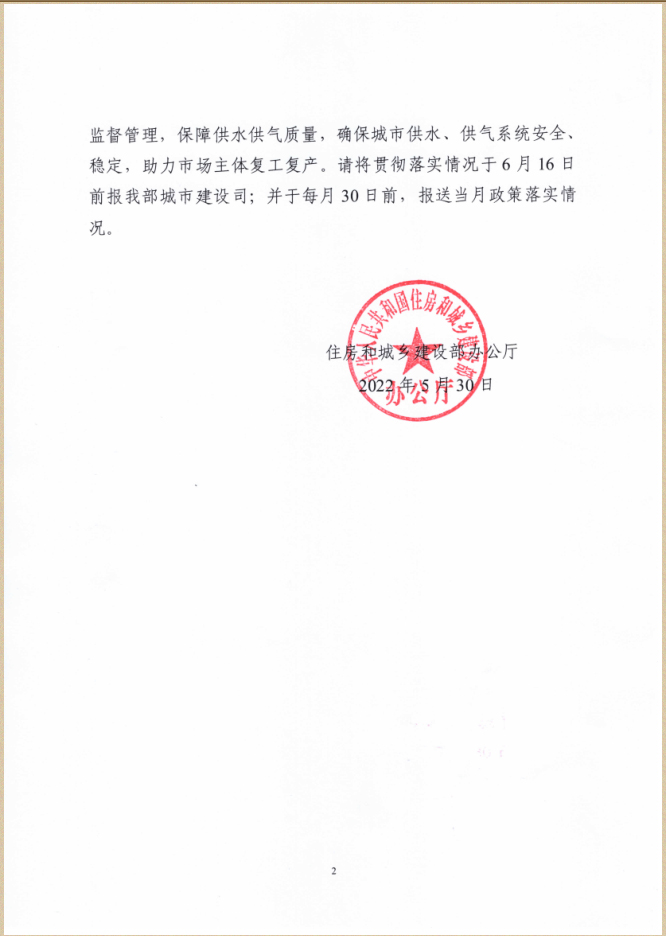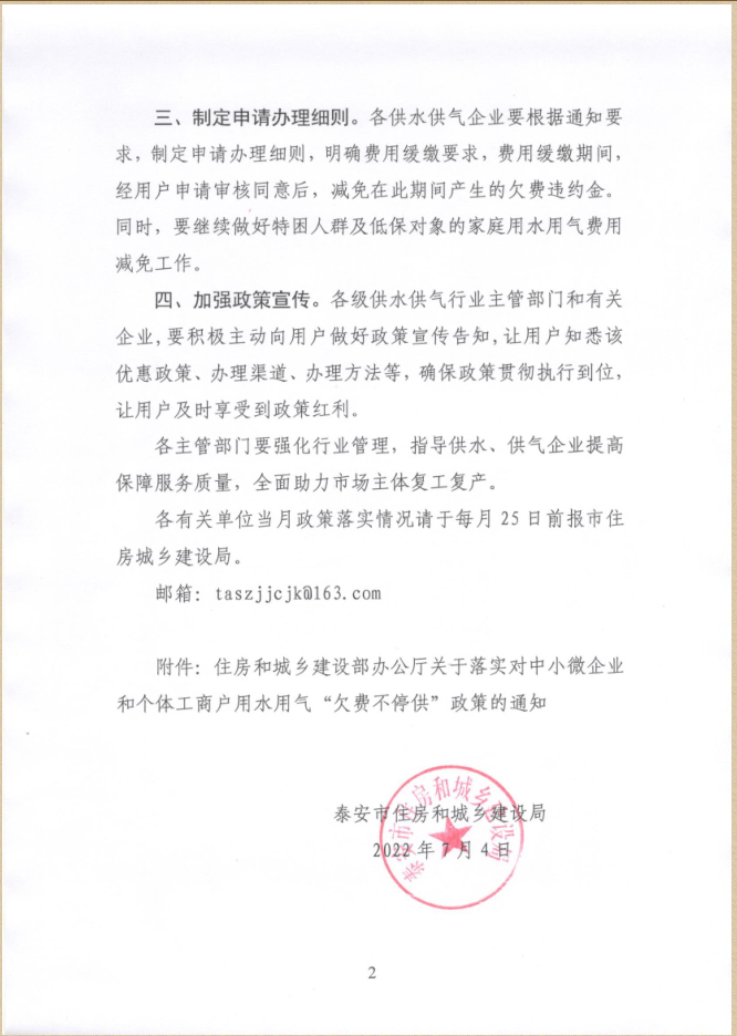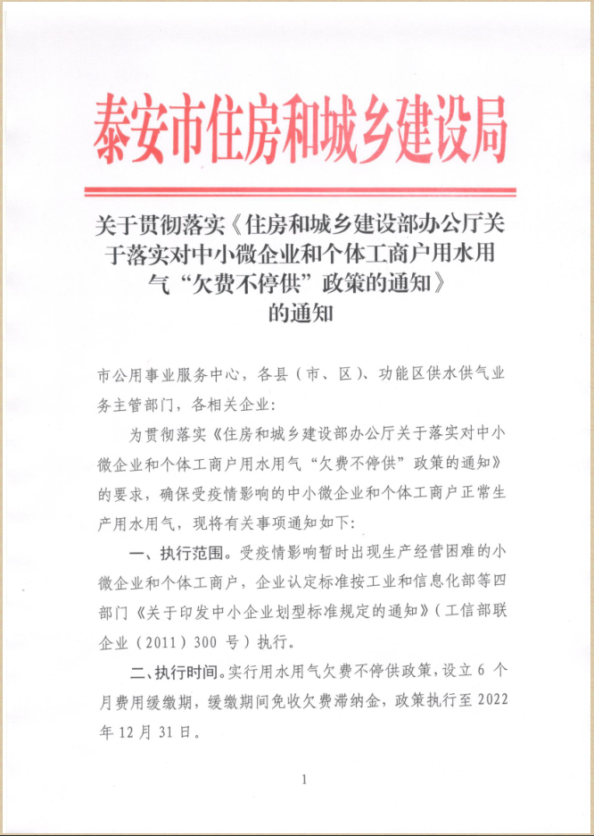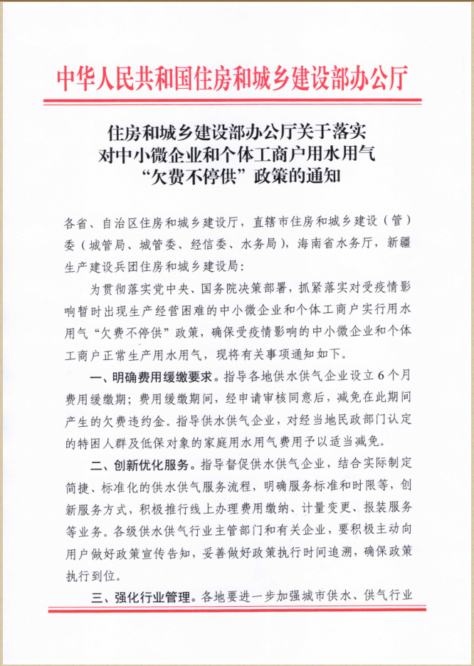 您当前位置》政策法规》关于贯彻落实《住房和城乡建设部办公厅关于落实对中小微企业和个体工商用户用水用气“欠费不停供”政策的通知》的通知